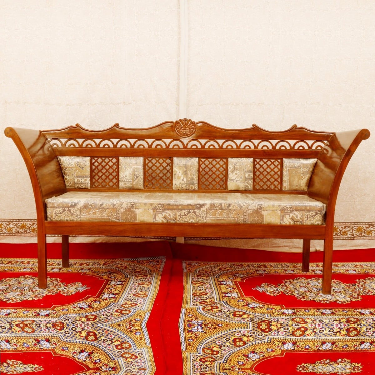 Aesthetic Teak Wood Three Seater Sofa, Bring this aesthetic sofa set home and watch the compliments flow each time you throw open your doors to entertain family and friends in your precious space. The carving of this sofa set is set in layers above and below the placement of the firmly fixed cushions which makes it a rather interesting design. The curves on top and the crisscross pattern below are quite a fusion style setting, while the subtle leafy print on the upholstery takes it all to the next level. The pinched minaret-style carving on top is like the icing on the cake. You can place this sofa set in your living room and layer it with a bright rug and some bright cushions to match the same.