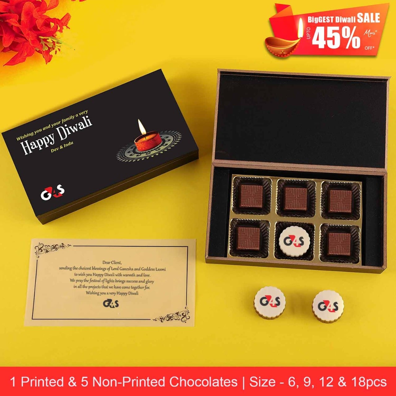 Add a personal touch to your corporate Diwali gifts by picking a personalized chocolate gift for your clients or employees. You can print your company logo or brand name on the beautiful black designer box which is full of Diya printed chocolates and a personal Diwali wishes message to make someone’s Diwali extra special.