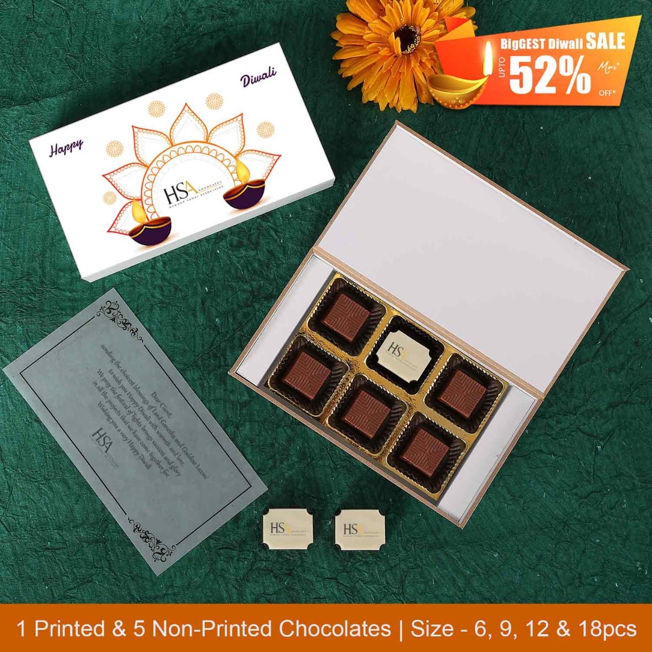 Diwali is a special festival during which you need a lovely corporate gift to greet your clients, employees, business partners, etc. Explore our amazing collection of corporate Diwali gifts of chocolates. The delicate festive design printed white modern box of personalized chocolates is the perfect fit for you.