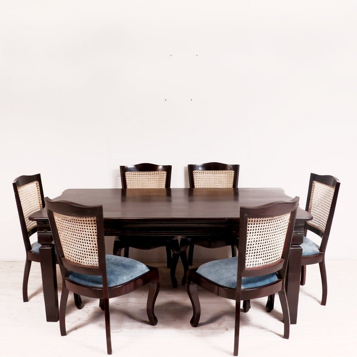 Classic Cane Chairs With Modern Dining Table 6 Seater Set, The table itself is a columned beauty that relies on stark and symmetrical engineering to show off its rich wooden grain. The square-edged neutral-hued seats add a touch of contrast to the entire set while you are free to play with many colors for the table linen.