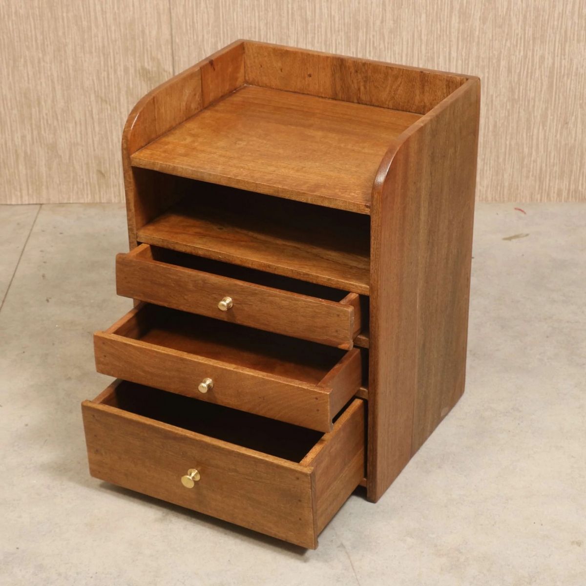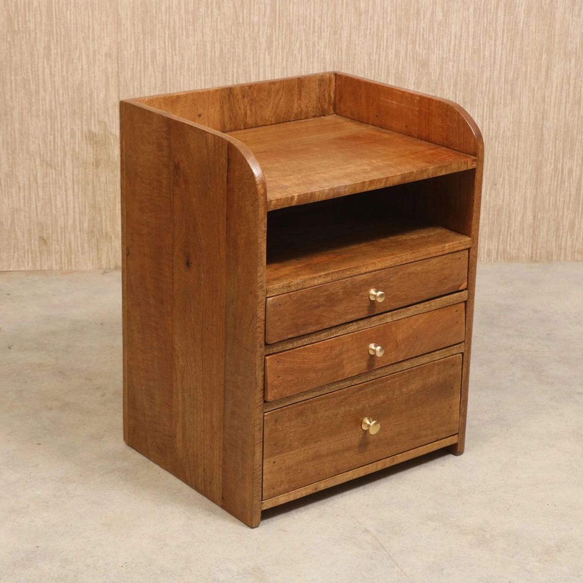 Classic Curved Top Bedside, The beautiful finish of this wooden curved top bedside table will surely add more charm to your bedroom. The curved top adds a hint of elegance and modesty. The brass knobs give a rich twist to the simple design of the table. If you’re looking for ways to make your bedroom decor come together, this is your chance. The table has one large-sized and two small-sized drawers, which is ideal to keep your valuable documents, jewelry, cosmetics, or even napkins. The empty shelf given with the table is ideal to store your phone or laptop. The sturdy utility table top is the perfect place for a decorative lamp or a vintage alarm clock.