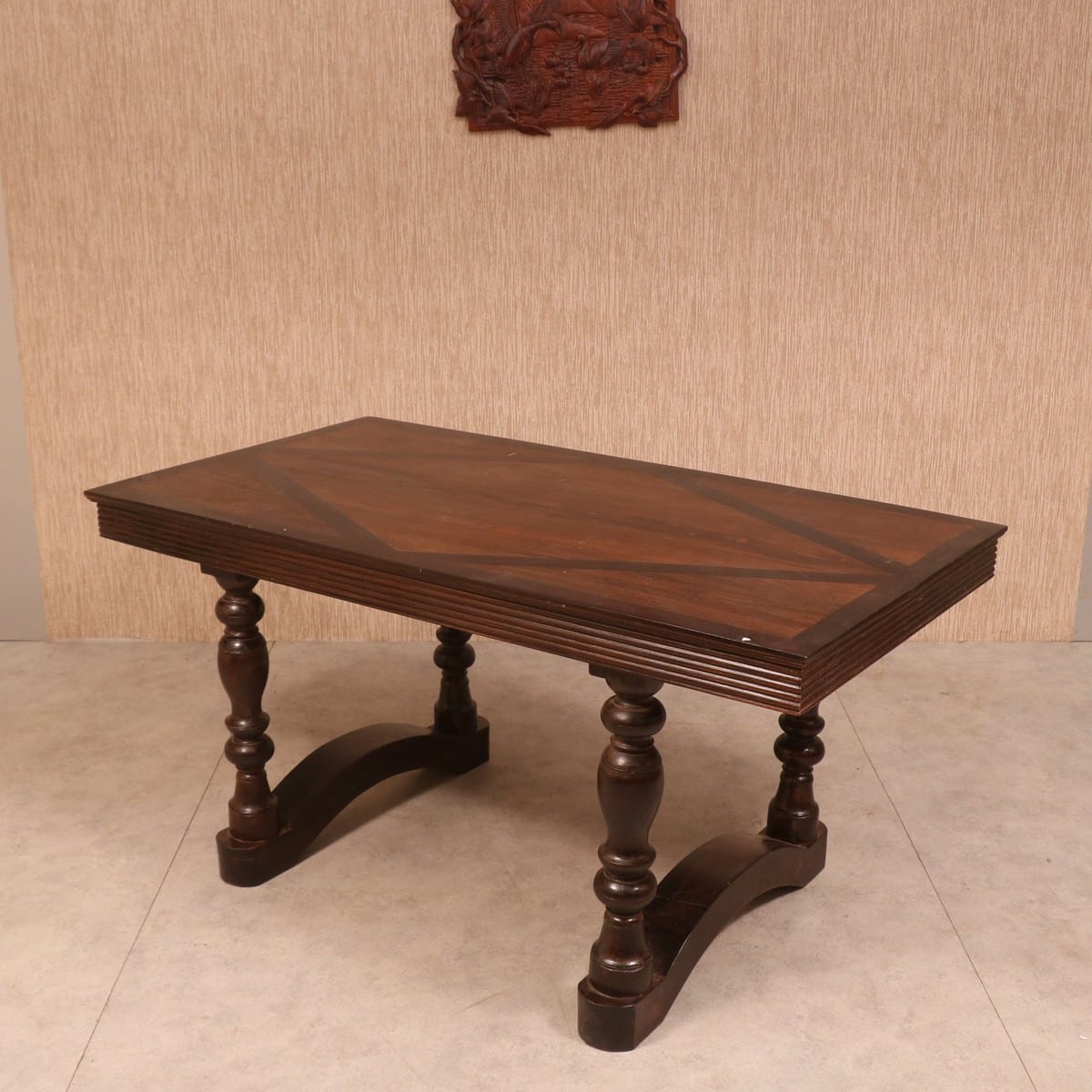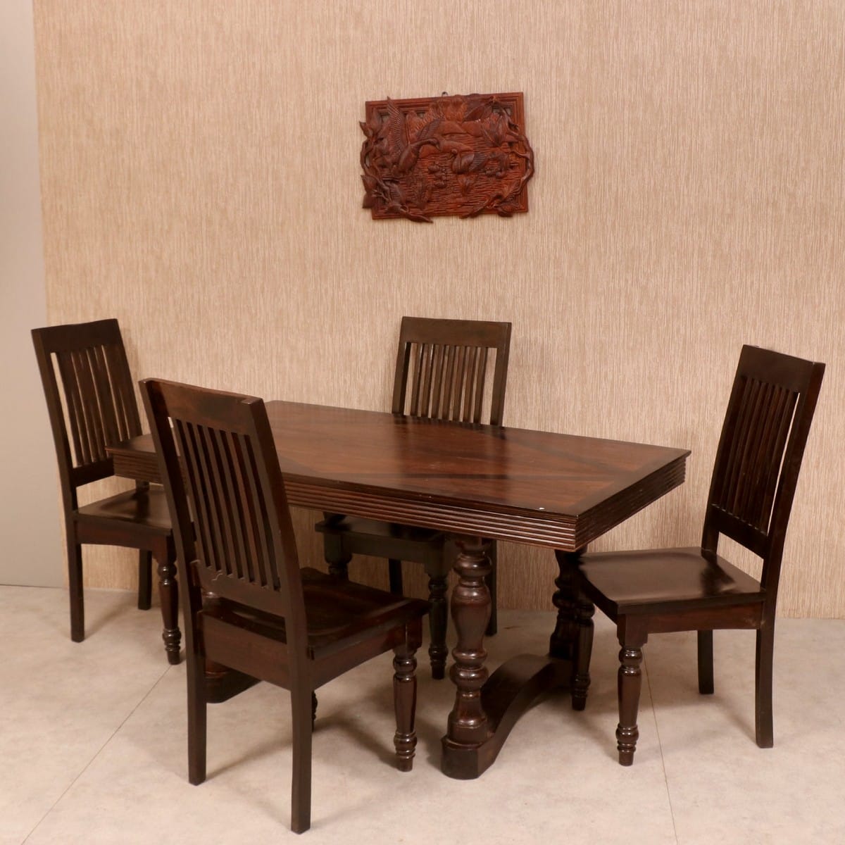 Classic Emperor Style Dining Set, The pillars and the wave-like wooden features on the bottom accentuate the beauty of this solid and stylish dining table. It is safe to say that this table is fit for not just a king – but an emperor, even! The solid wood dining table and the chairs have been designed in keeping with the classic elements like rounded pillars and wooden strips for the chair backs. While it is a compact piece that can fit into any corner of the home, the craftsmen have ensured that they go big on style and have accordingly rendered the proportions to the eclectic and elegant elements here. You can use vibrant and neutral-hued table linen with this set for the day-to-night table setting style.
