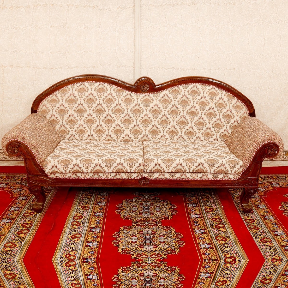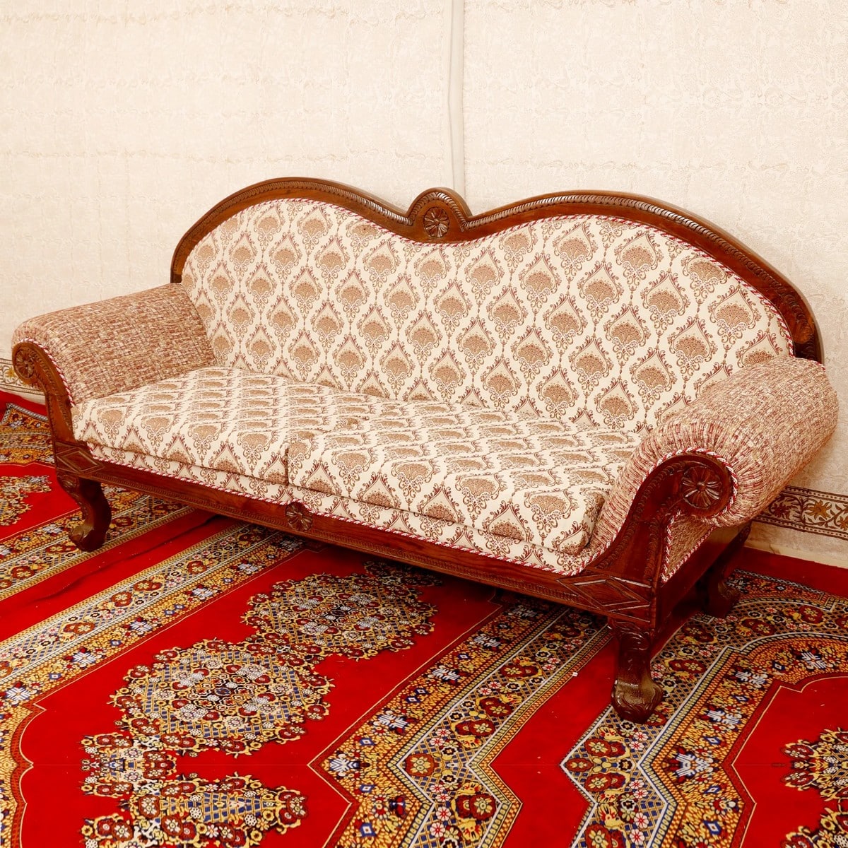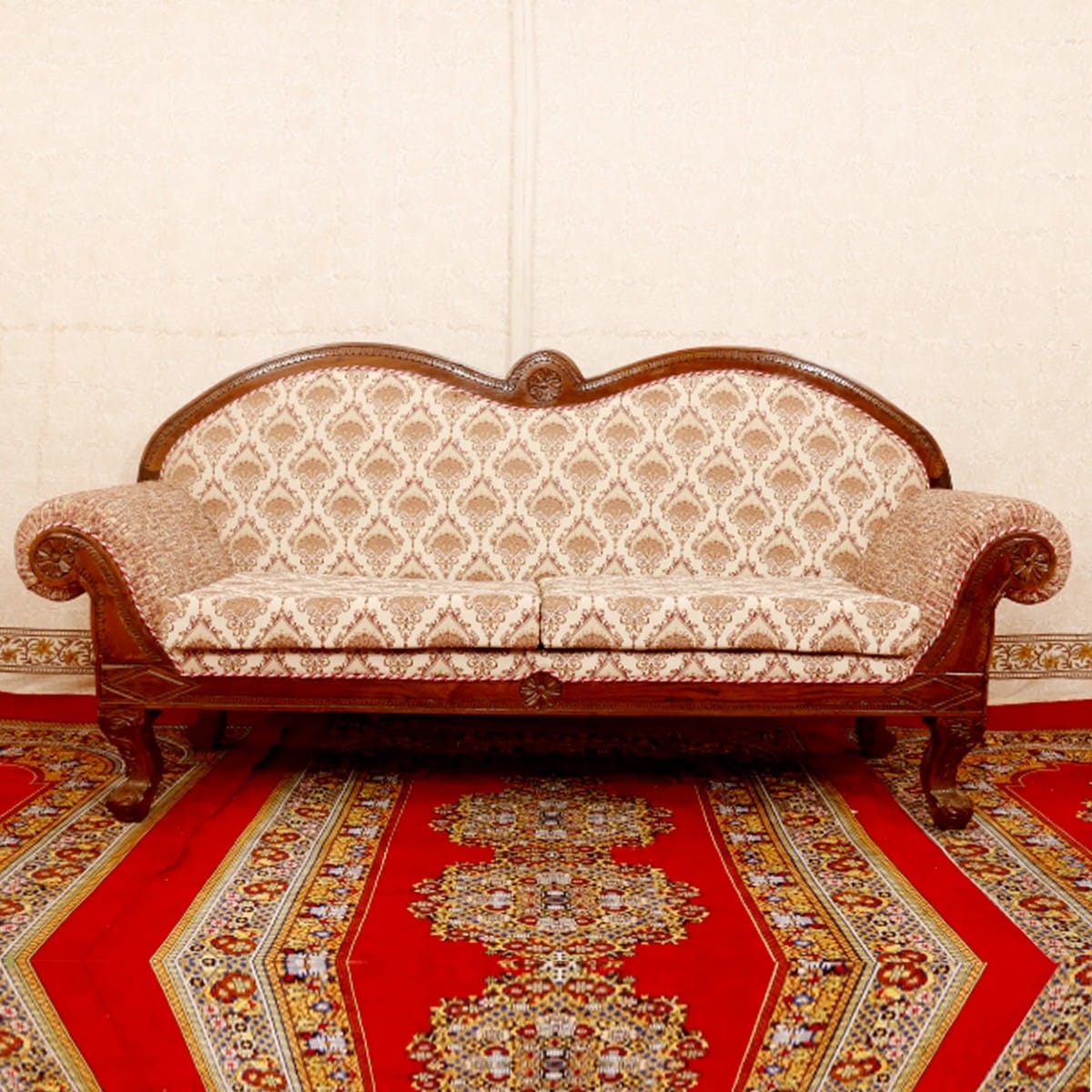 Classical British Crafted Royal Teak Wood Three Seater Sofa, A large or bigger sofa set like this one would truly have a commanding vibe in your space. Imagine placing these three spaces to fill the corners of your home with a truly luxurious look. That is what a large sofa set can do for you and your senses! The pretty pattern is a Mughal-inspired print on the upholstery that adds that look of luxury like none other. Yet, at the same time, this wooden sofa set retains a delicate look with curves on top and armrests as well. The woven fabric on the armrests is quite a contrast with the delicate print on the rest of the couch which makes this such an interesting sofa set for your home.