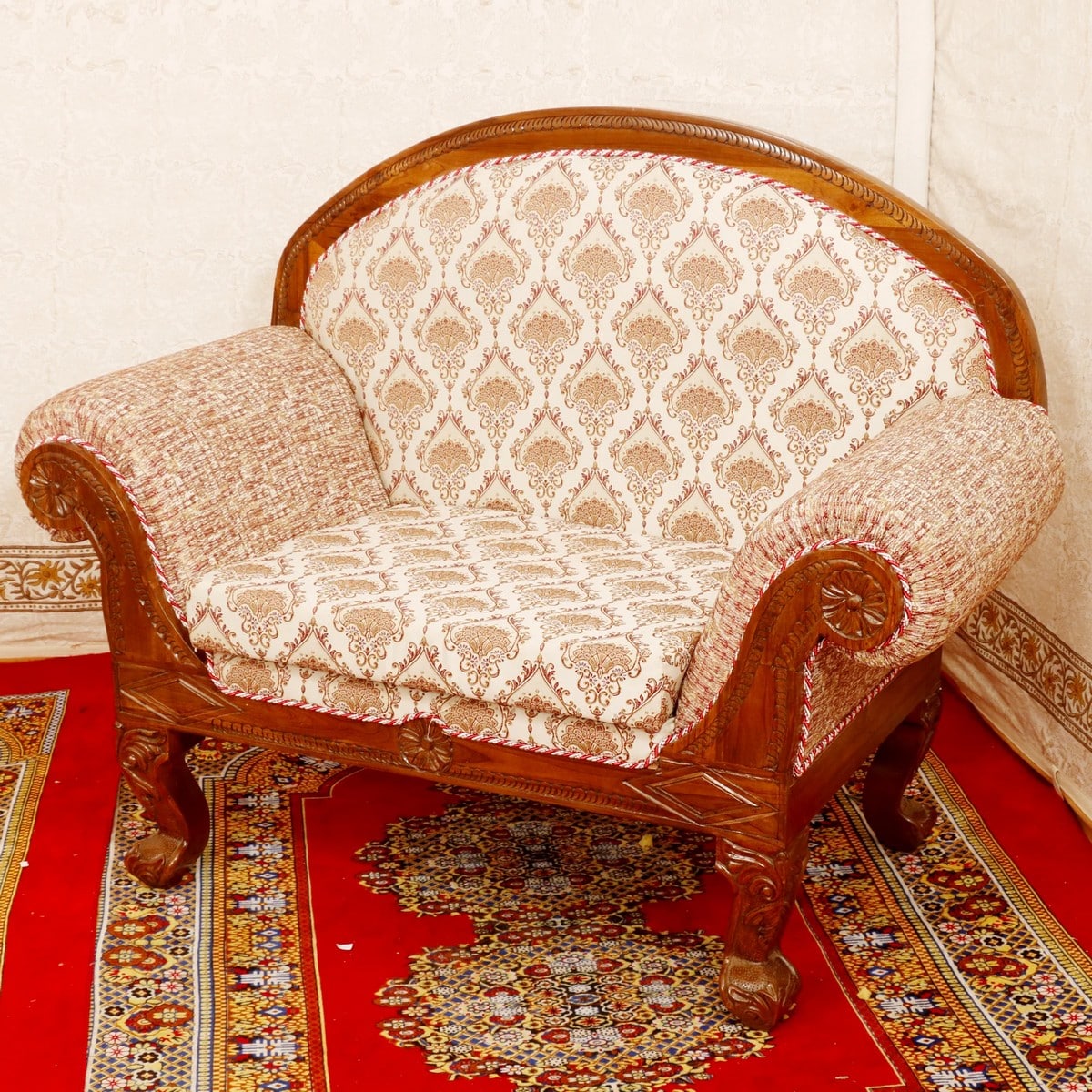 Classical British Crafted Teak Wood Royal Single Seater Sofa, A large or bigger sofa set like this one would truly have a commanding vibe in your space. Imagine placing these three spaces to fill the corners of your home with a truly luxurious look. That is what a large sofa set can do for you and your senses! The pretty pattern is a Mughal-inspired print on the upholstery that adds that look of luxury like none other. Yet, at the same time, this wooden sofa set retains a delicate look with curves on top and armrests as well. The woven fabric on the armrests is quite a contrast with the delicate print on the rest of the couch which makes this such an interesting sofa set for your home.