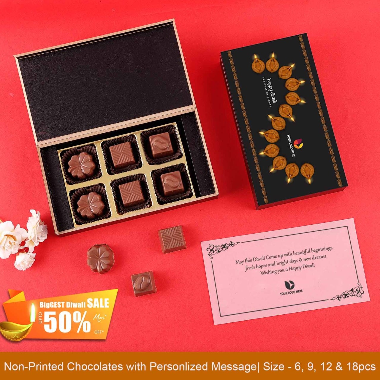 Explore many beautiful and trendy corporate Diwali gift ideas here at ChocoManualART. Our holy lamps printed Diwali gift box of chocolates are perfect to make your clients and employees feel delighted. You can personalize these scrumptious chocolates with your company logo printed on them.