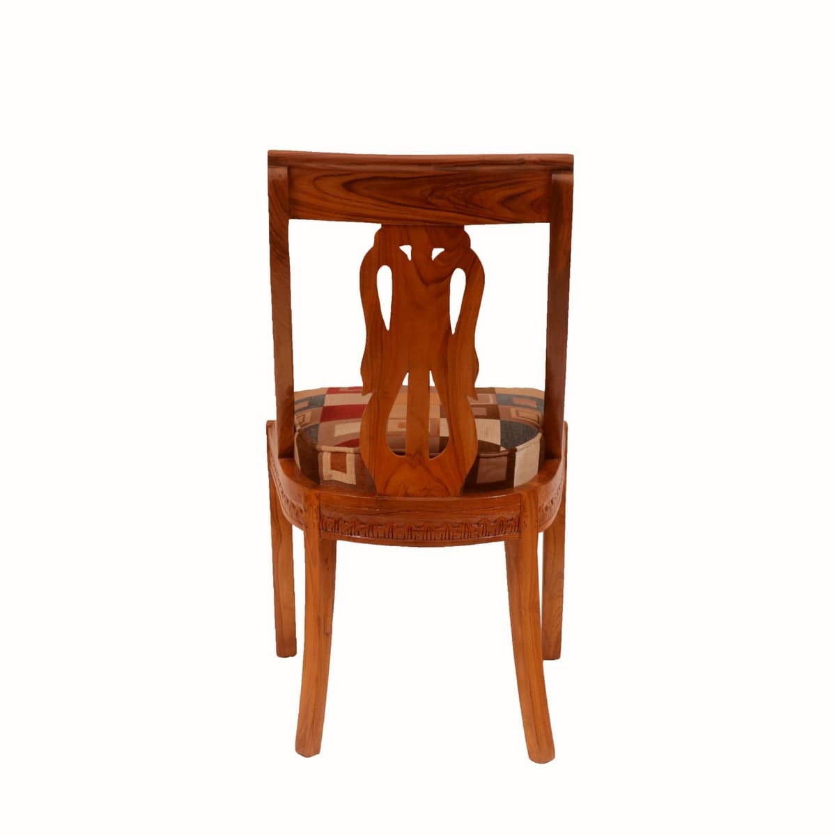Flora Wooden Carved Chair (Set of 2), The beautiful floral pattern will immediately attract your attention. The modern patterned upholstery is the perfect folly for the simple stem and leaf pattern that has been carved onto a thick block of wood in the back. You can use these chairs in sets of four or six around the dining table. It would be best to pair a set of these chairs with a glass-top table. You can use the chairs in pairs in the living room as well. This pretty chair would also sit well in front of a dressing table in the bedroom.