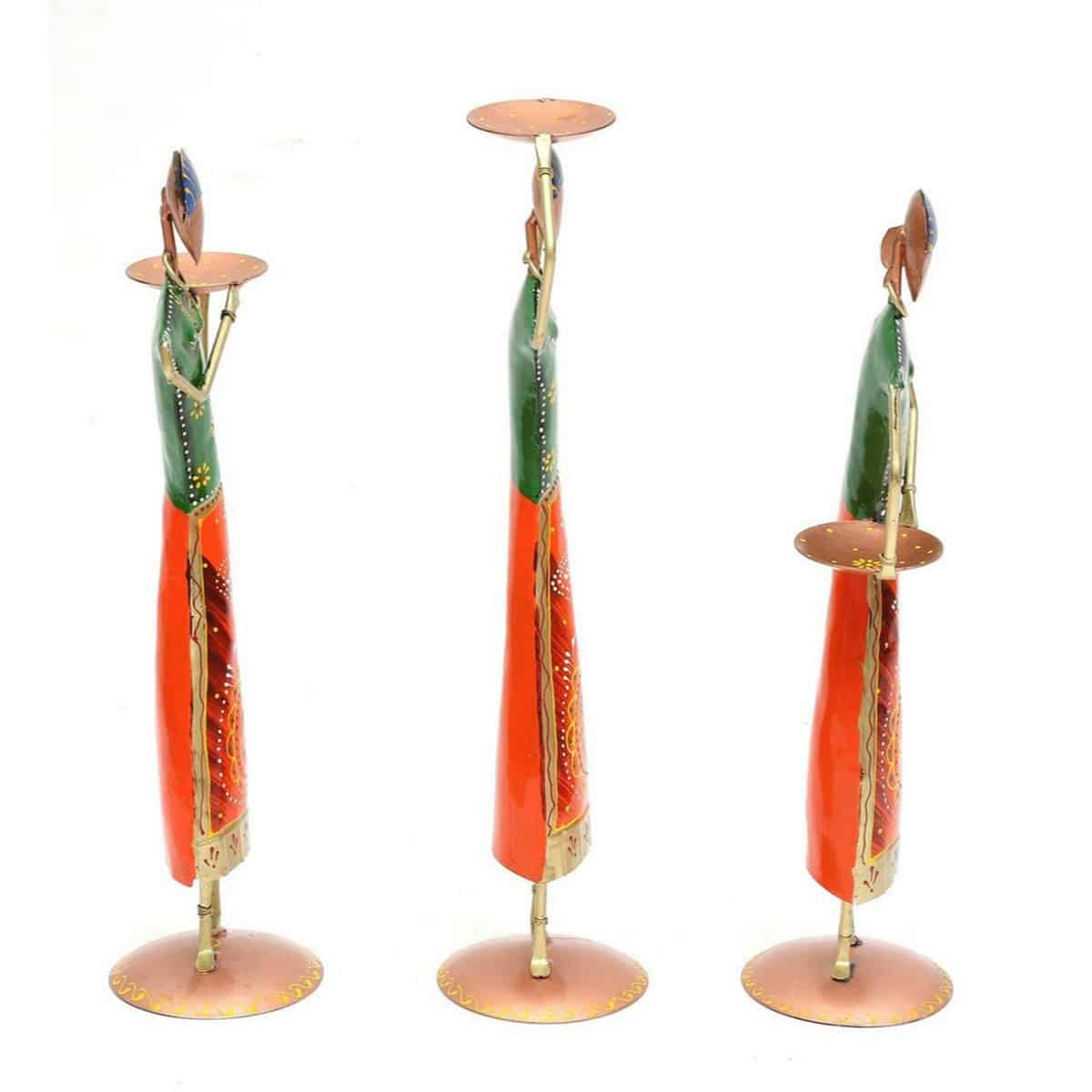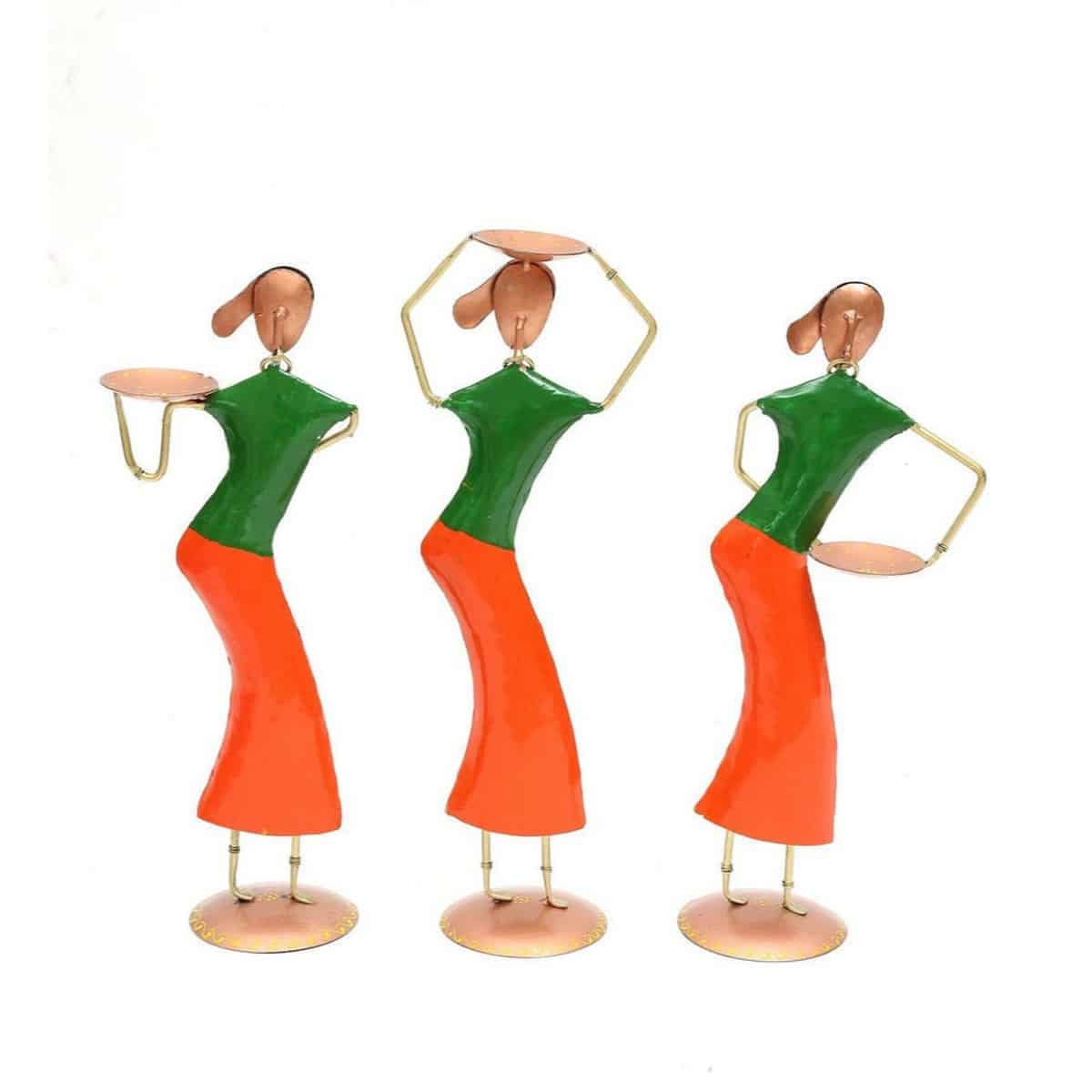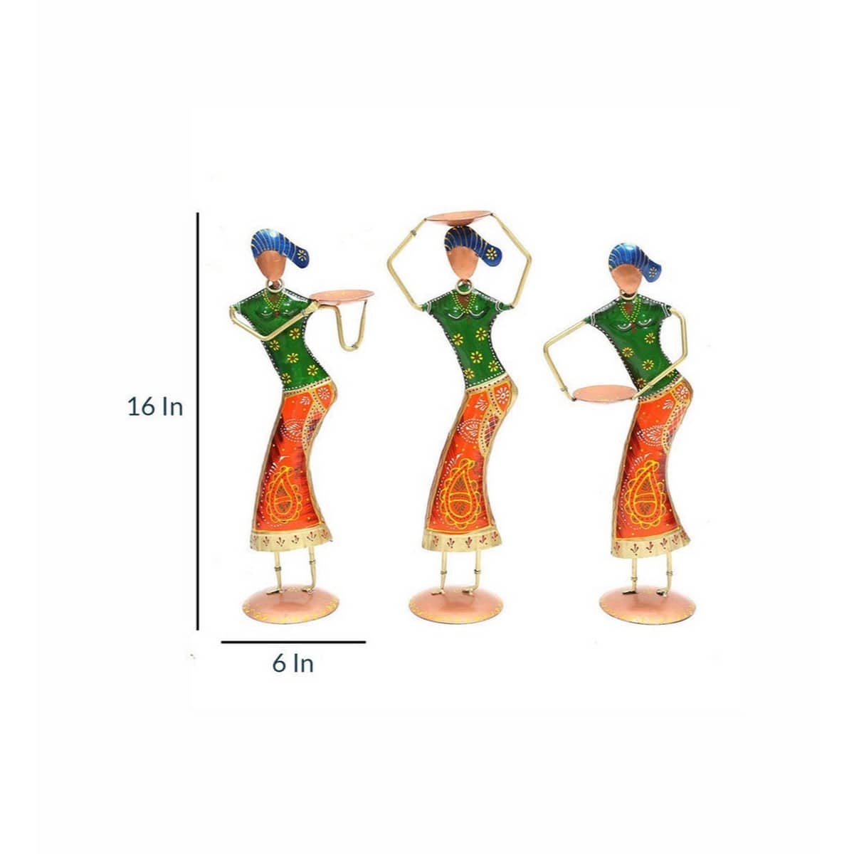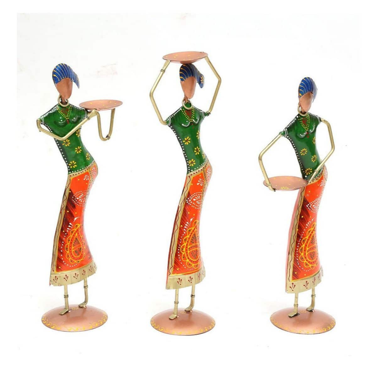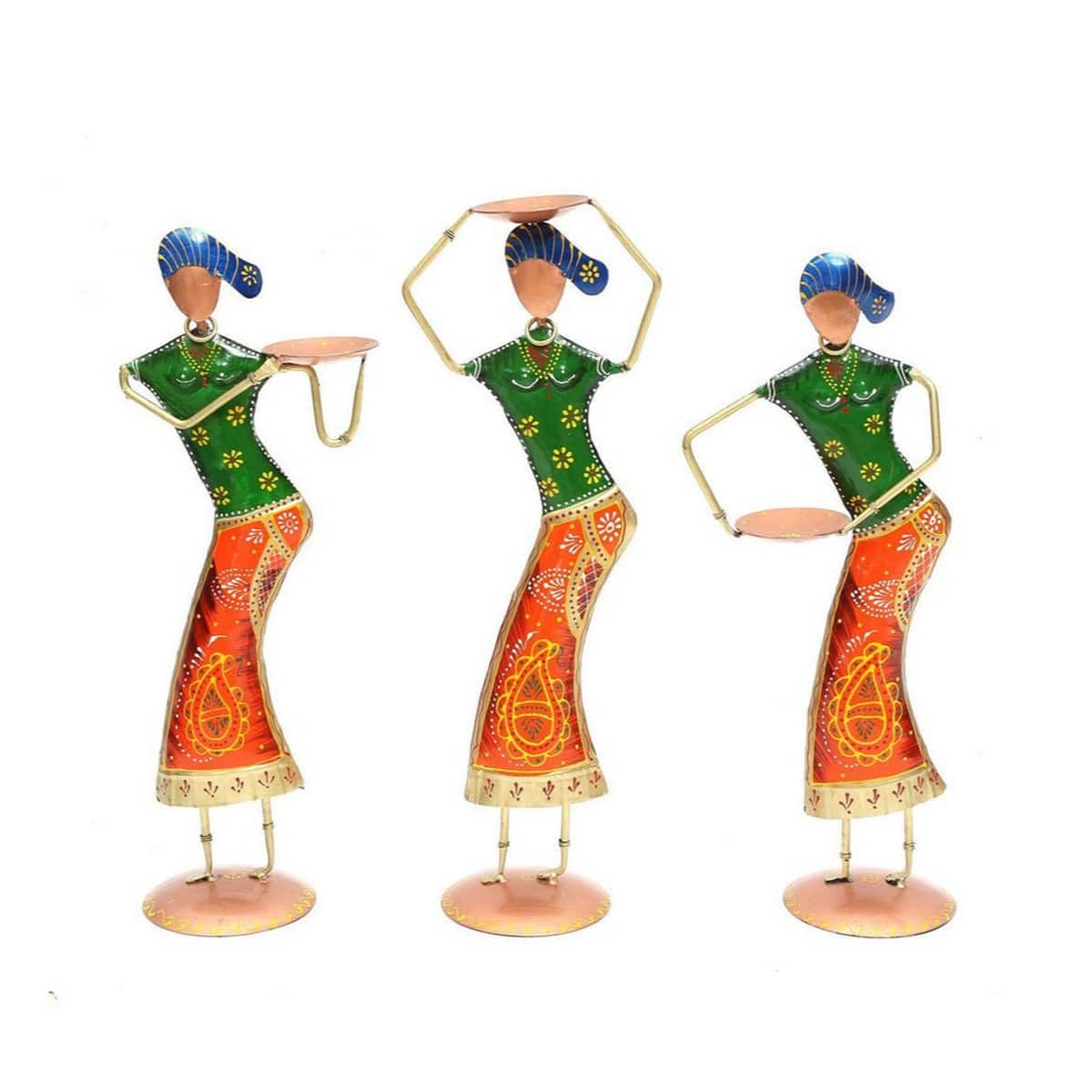 Lady Farmer Antique Motif Metal Showpiece (Set Of 3)