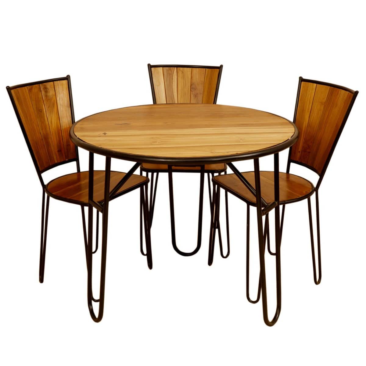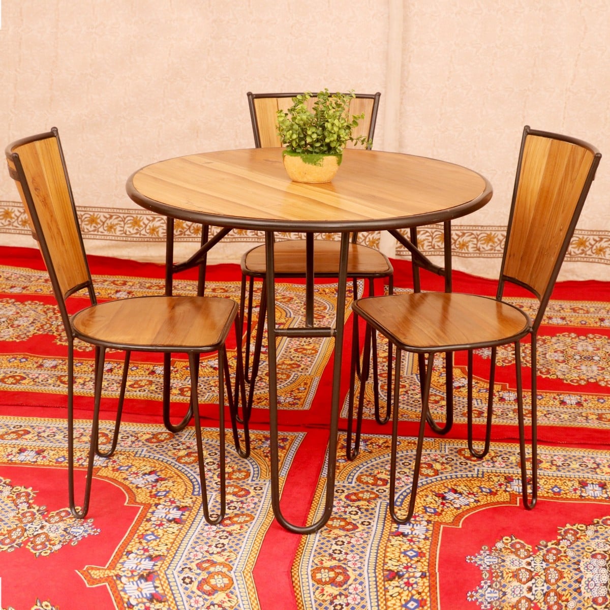 Modern Folding Dining Table – With 3 Chair, This folding dining table does the simple modern like none other! Not only can you easily fold the legs to create more space as and when you want, but you can stow and retrieve at will. The round top accommodates a symmetrical circle of wood that has been polished to reveal its natural best. The wrought iron structure holding this table top has rounded rods that have been fixed with each other, and facilitated with hinges where required. You can take this folding dining table to the terrace top and bring in some quirky wrought iron chairs for some breakfast fun, or you can have a hip-looking dining room with this table and colorful metal chairs bearing floral cushions.