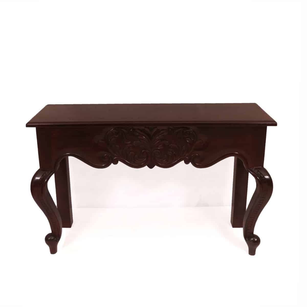 Natural Solid Wood Fusion Style Carved Console Table, This dark polished end table has quite a rich look, thanks to the hue as well as the fusion style legs that are carved in the front and trendily linear behind. This gives the regal table a contemporary edge, so that you can pair it with a number of eclectic furniture pieces and paintings in the foyer or the living room.