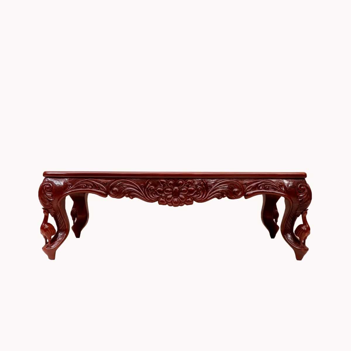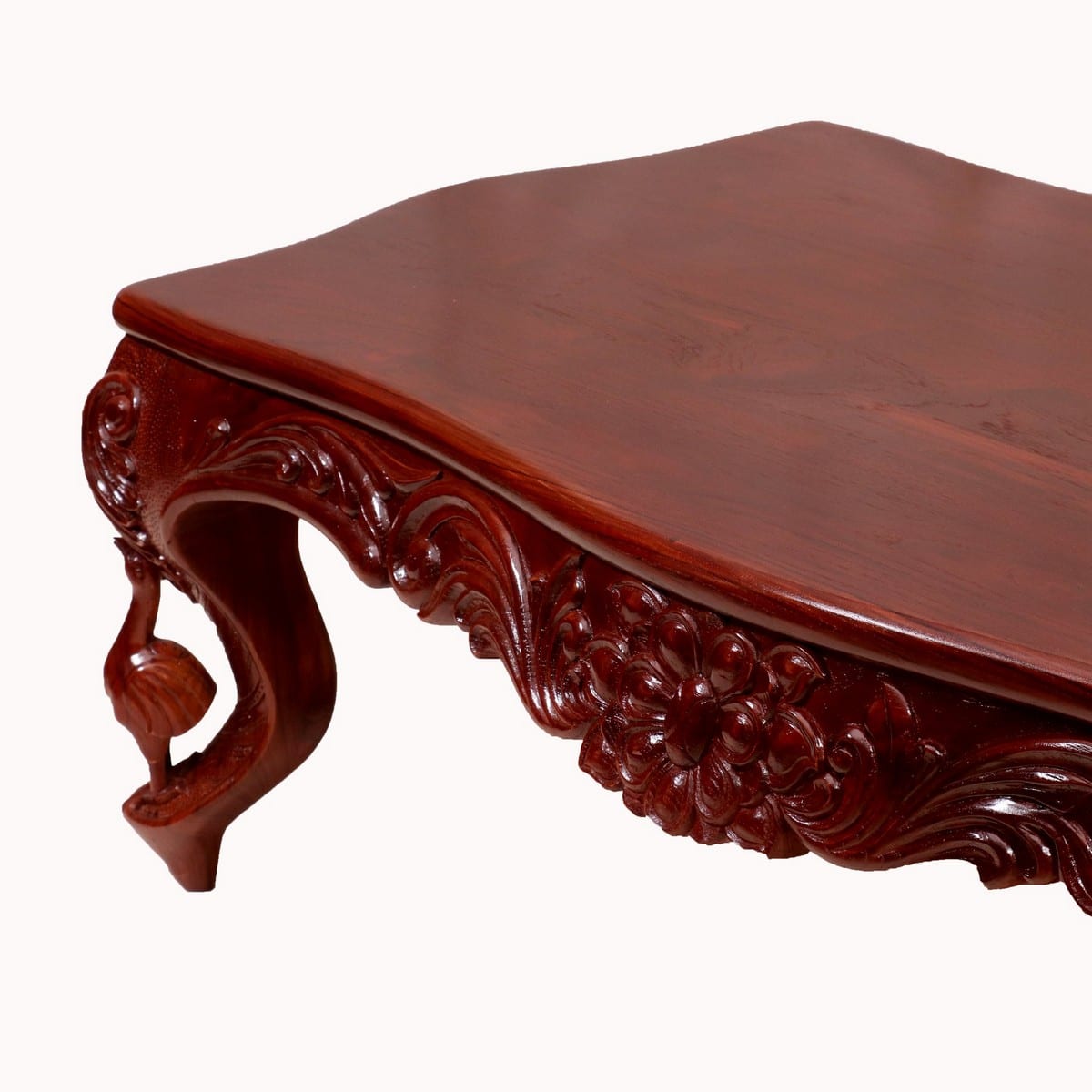 New Design Teak Wood Majestic Solid Coffee Table, This coffee table is all things grand and royal. The solid wooden legs show off intricate carving that flows upwards to line the sides under the table top as well. The gleaming polish makes this piece a must-have for an elegant setting. You can place this table in a room that has carved furniture or even leather upholstered pieces. This coffee table can easily elevate the design quotient of any room it is placed in. You can try layering this table with a gold embroidered runner or coasters. Also, you can place a brass tray or crystal artifacts – and watch how those compliments flow when you entertain your family and friends around this beautifully carved piece of furniture!