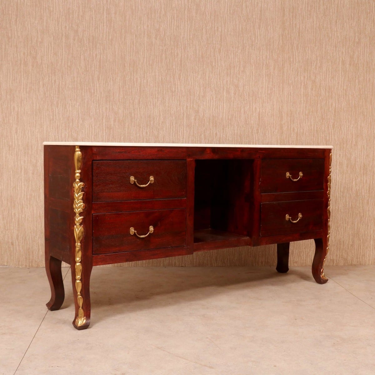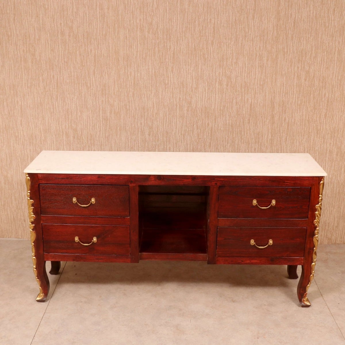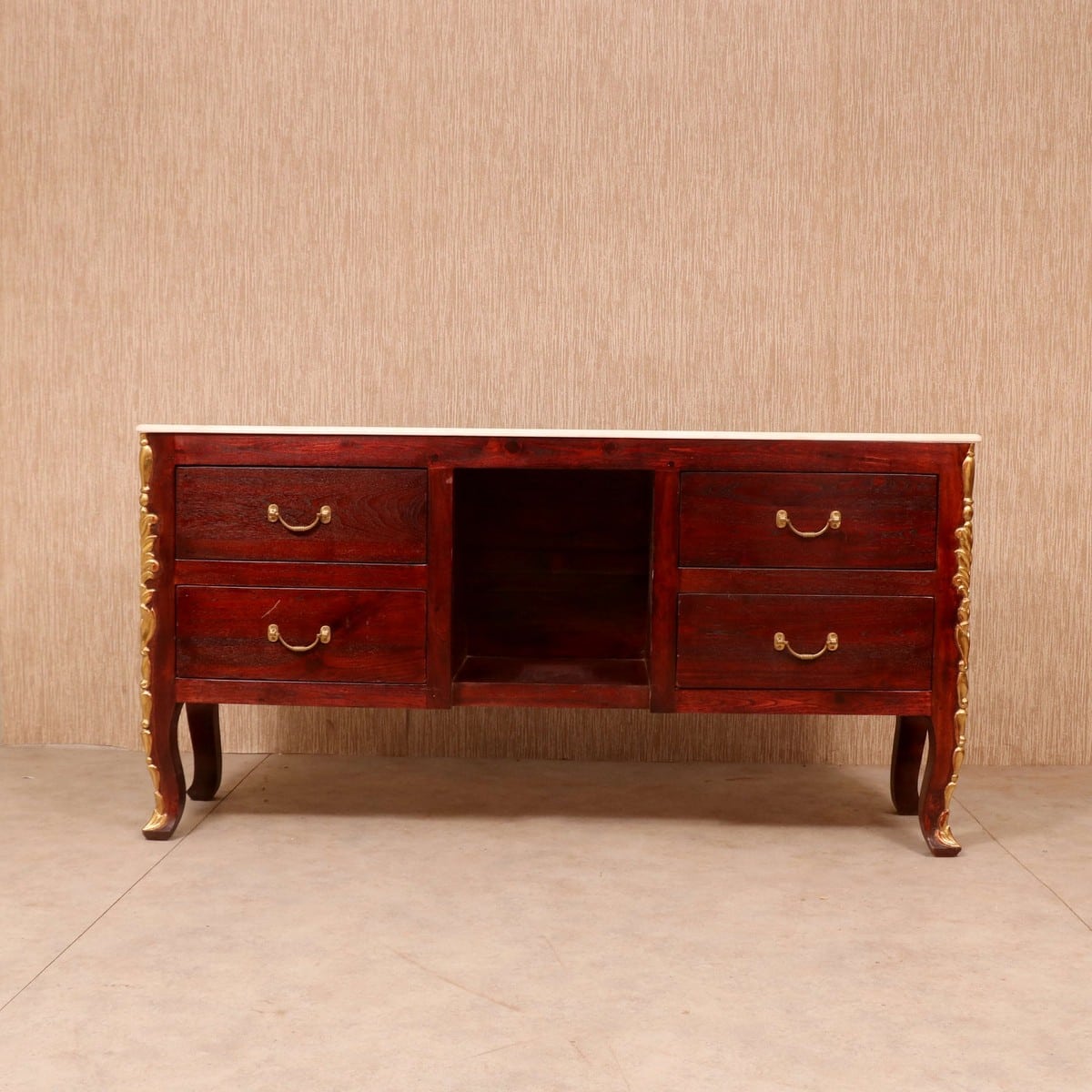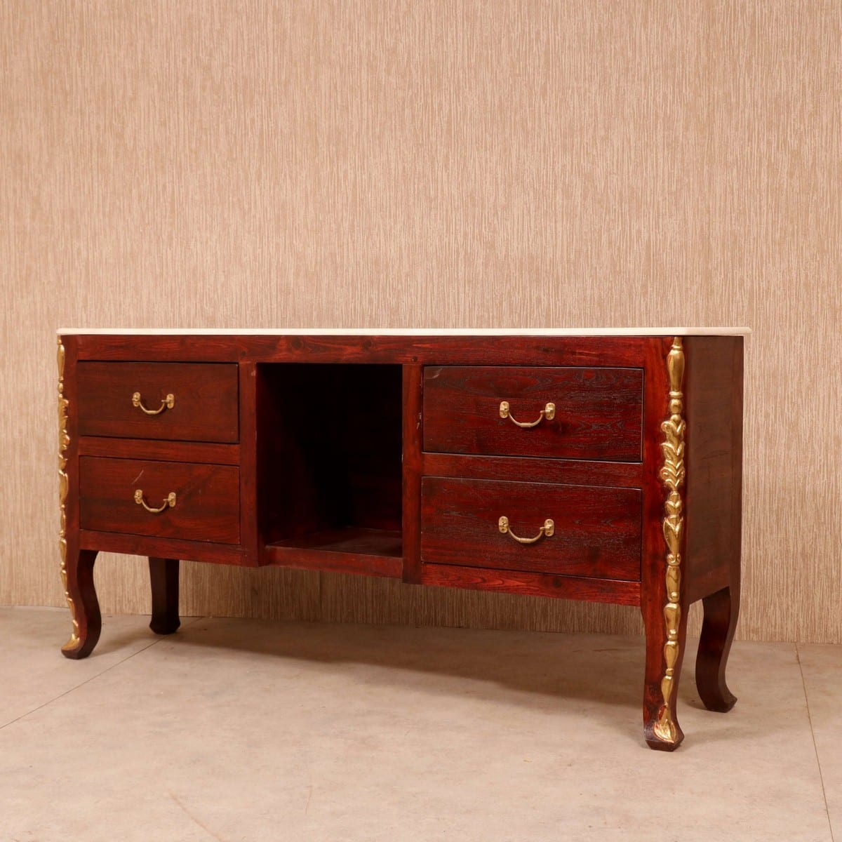 New Design Teak Wood Roi Loius Console Table, The curved legs and the brass trimmings on this Roi Loius console give it a royal touch. Perfect for a vintage dΓ©cor theme, this console would be just the thing for the dining area, with some candle stands and photo frames on the top. The brass edging on the legs is intricately designed, to add flavor to the vintage motif. This console would work just as well in the living room with a handcrafted mirror on top to balance the design. The brass pull-outs on the drawers are just right for this beautiful piece. The middle section of the console is ideal for placing a vase.