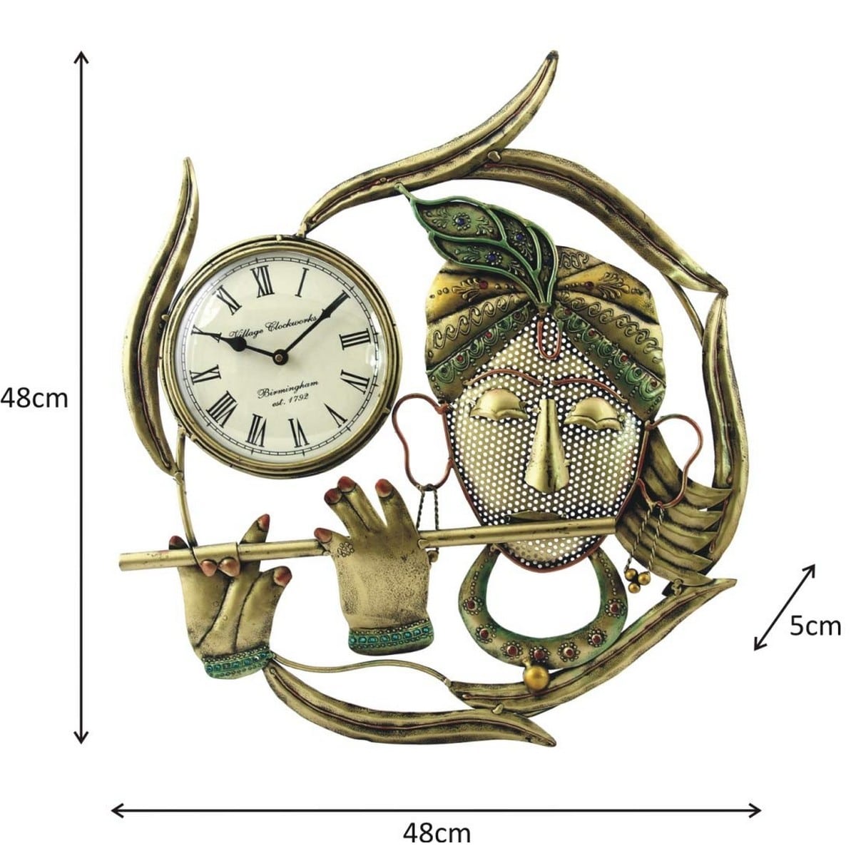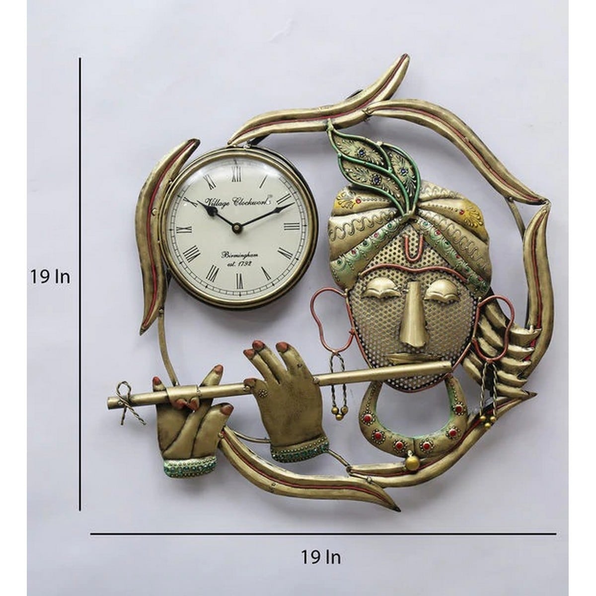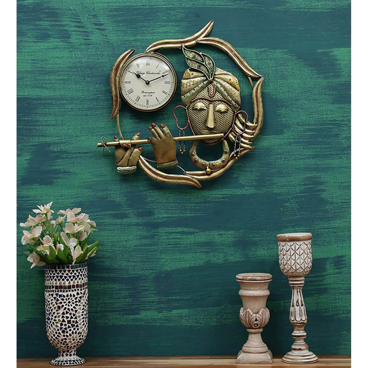 Are you a lover of artistic artwork or something that is abstract in appearance to catch first glance? If yes, then, you have come to the right place to lay hands on this designer Krishna Ring Wall Clock only available here. It is a designer wall clock in Lord Krishna designed ring shape in big size for the living area, bedroom, or kitchen space. The round looking wall clock has an artistic sense of style in terms of its flower decoration and metallic touch appeal.