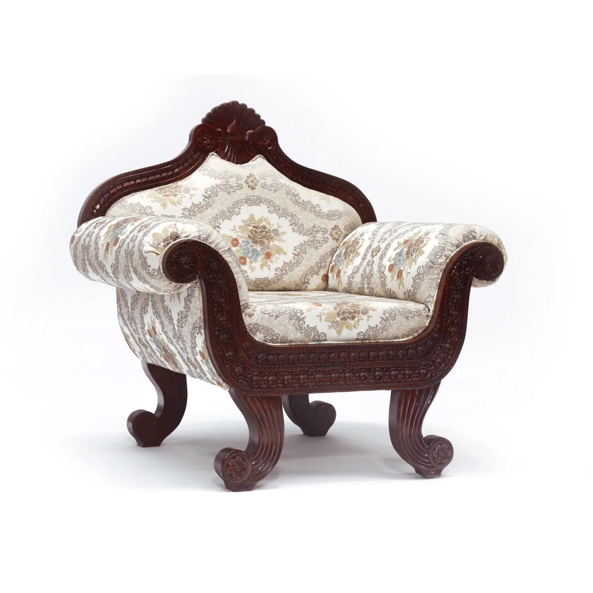 Solid Teak Wood Intricate Carved Single Seater Sofa, It is a well-known fact that a sofa set is an indispensable element of a living room. It is hard to imagine this room without one. Blend style and comfort for your living room seating area with this sofa set, which is designed to provide maximum comfort. The fabric of the sofa is made of top-notch quality. Its elegant colors will definitely increase the aesthetics of the living room. The use of teakwood will ensure that the furniture is strong and will stand the test of time. With this sofa set, you can feel confident about hosting guests for any occasion.