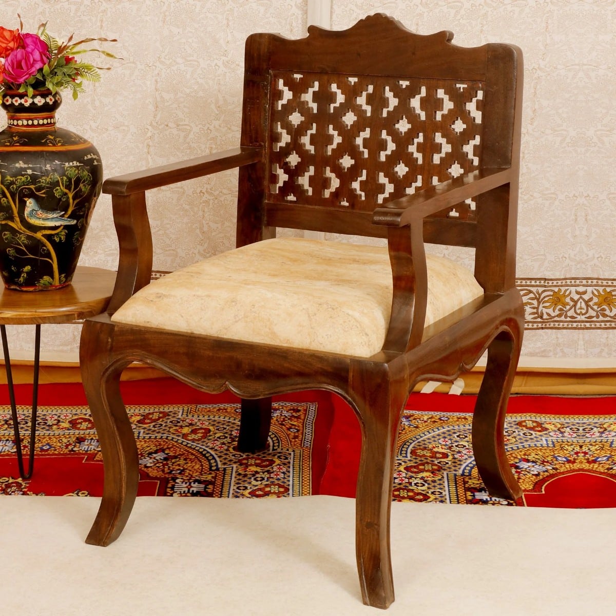 Classic Carved Solid Wood Romes Single Seater Sofa, Have you ever been to a fort in Rajasthan or any other part of India and wondered at the richness of craftsmanship and the purity of creativity that you see in every corner? Have you found yourself wondering how the craftsmen were able to bring in such delicate inlay, filigree, and even Jaali work to stand out so beautifully in lofty palaces and forts? Well, it’s time to bring some of those sentiments home with this Romes sofa set which will take you right back to the royally good times – and help you recreate a few memories too! The natural wood finish of this sofa set gives it a distinctly urban edge even though it is busy flaunting its ethnic roots with the amazing carving.