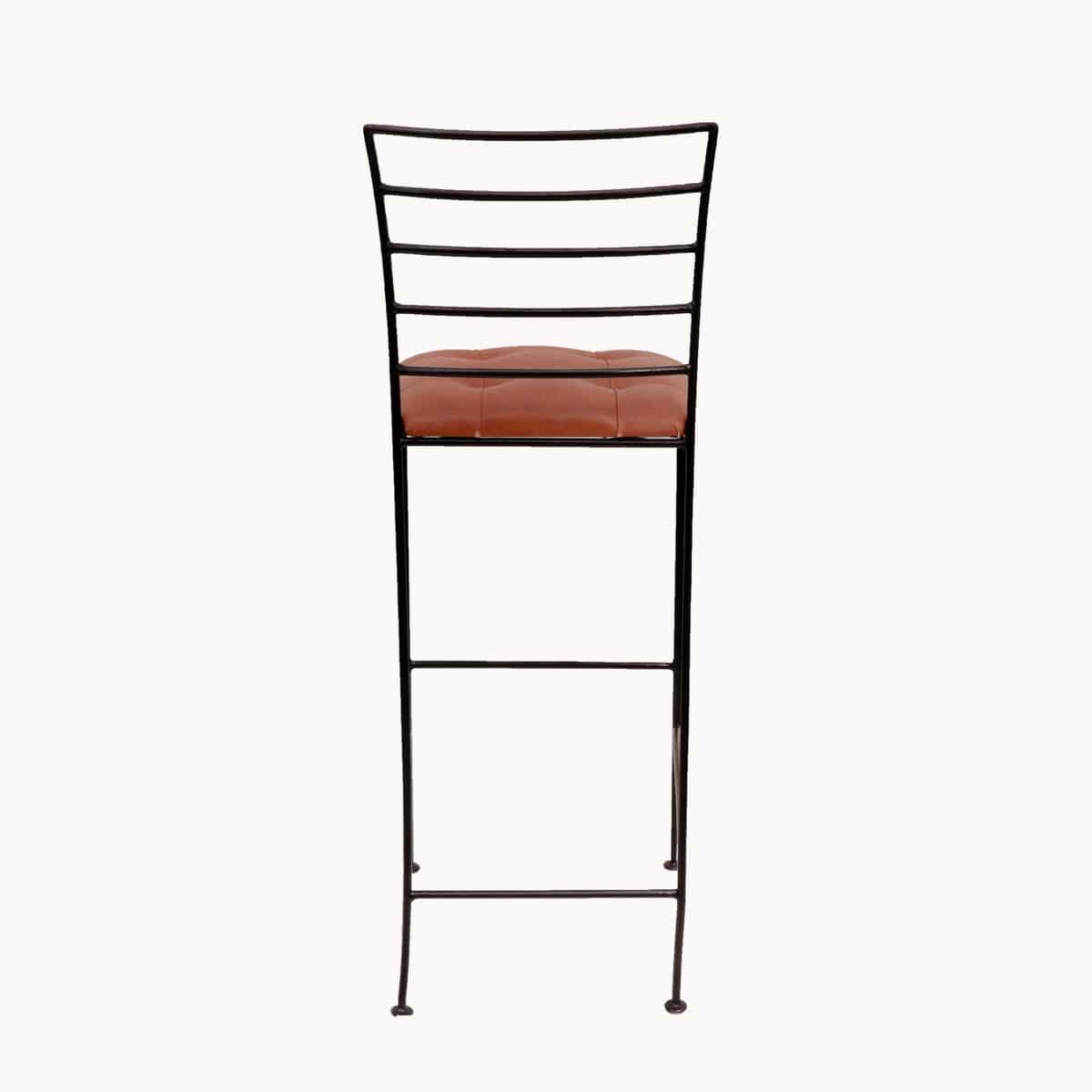 Stylish Iron Backed Chair, The simple rods in this chair create a style statement like none other. You can use this chair in a set of four or a pair or two so that you have a tall stool on which you can park yourself next to your bar. The brown cushion is the perfect contrast with the black delicate looking rods of the wrought iron structure of the chair.