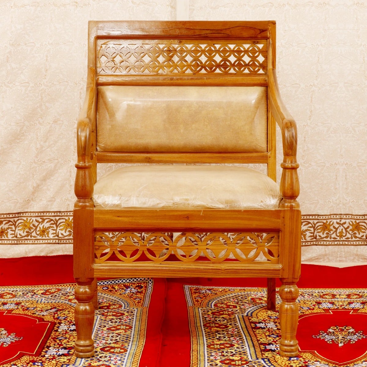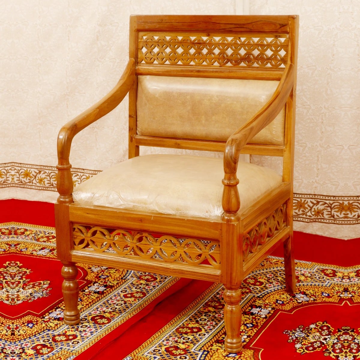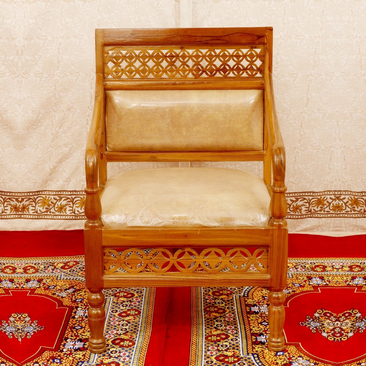 Carving Teak Wood Single Seater Sofa, Bring in the magic of ethnic palaces and forts to adorn your living room or any other space of your home. This carving sofa set is here to actually add some royal panache to your space. The carving on the top and the bottom with nothing in between but luxurious cushioning is quite a treat for the senses. You can sit back and enjoy an evening with friends in the company of this beautifully carved sofa set. Add some cushions and some dim lighting to make it all come alive as you set those memories in motion with your loved ones, duly invited to share time with you in your treasured space – your home! Bring home this sofa set in teak wood for a sturdy addition to your home.