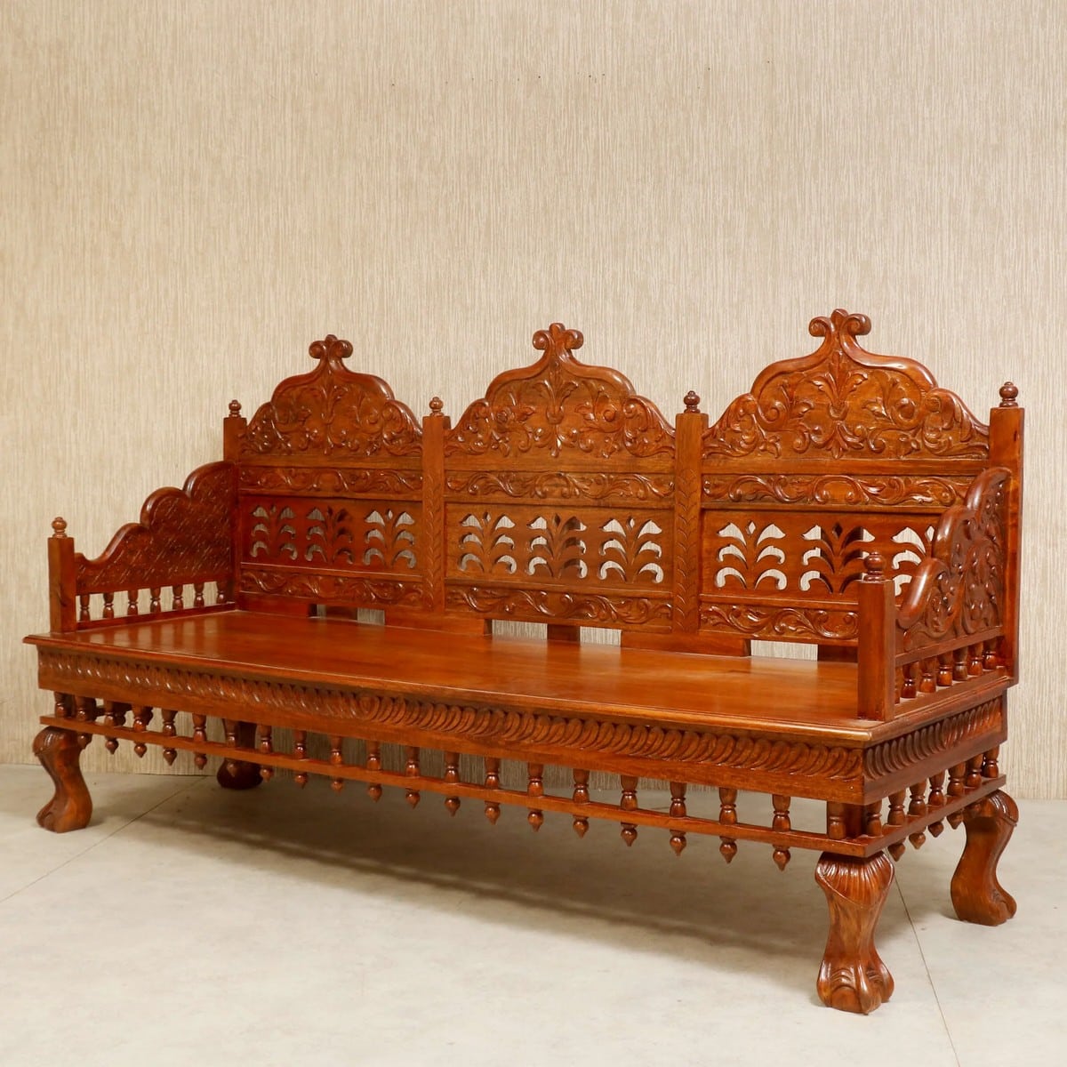 Vintage Folk Carved Traditional Sofa Set With Center Table, This sofa set looks straight out of a palace setting. Imagine sitting in your living room and sipping on a hot cup of coffee on a rainy day. The aroma of seasoned wood surrounding you, and the intricate details on the sofa set can give you the feeling of being a king or a queen. This traditional folk vintage carved sofa set with the center table will surely add a touch of royalty to your modern-day home. Our artisans have taken their time in getting each detail of the carvings right so that you can make this the perfect addition to your beautiful décor.