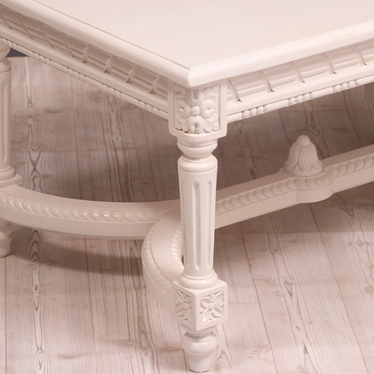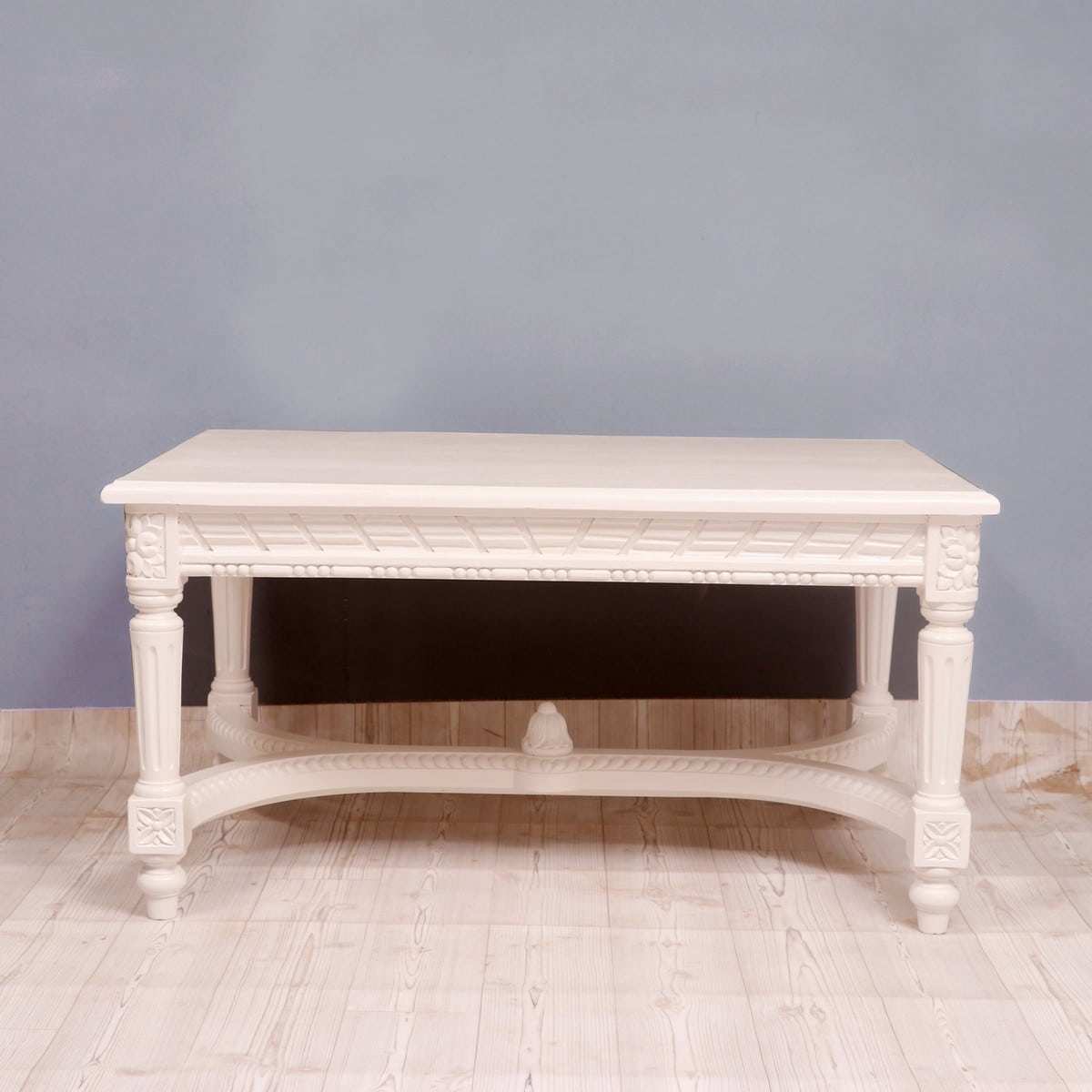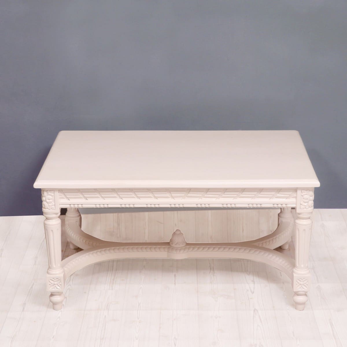 Ethnic Carved Intricate Design White Duco Teak Wood Coffee Table, The table top is wide and smooth making it easy to place someone on it without worry that it may fall off. If you need a coffee table to serve your guests, and also a low-height dining table for your small family, thereβs nothing better than this piece of furniture. Because the size and shape of this wooden table is a perfect fit for both situations.