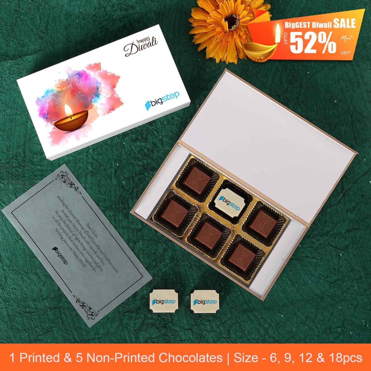 Logo Printed Chocolates with your branding. A respective number of chocolates printed with your logo or company name as per the box size you select. The ink is edible and safe for consumption. The print quality is good and clear. The remaining chocolates will be nonprinted i.e. assorted with optional fillings inside like Fruit & Nuts, Roasted Almond / Butter Scotch. The default filling will be Fruit & Nuts. Each chocolate weighs around 13-15 grams. It’s a blend of dark and white chocolate, neither too bitter nor mild. The taste is good and has been made considering the Indian taste.